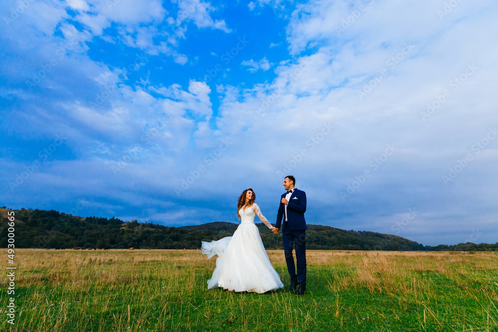 Newlyweds on a lawn near the hills covered with forest. they hol