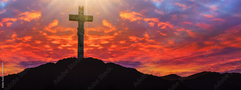 Easter background banner panorama religious greeting card Crucifixion and Resurrection. Cross crucifix with jesus of Golgotha by sunset.
