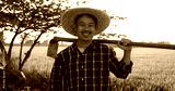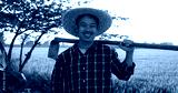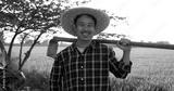 Happy Asian Farmer holding a hoe and looking at camera green paddy field on background.