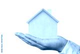A hand holding a wooden model house isolated on a white background.