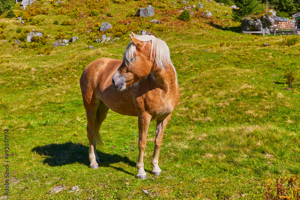 Schöner Hengst beobachtet seine Herde in den österreichischen Alpen.