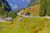 Österreichisches Alpenpanorama mit grasende Pferden.
