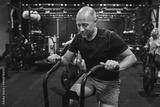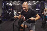 Smiling man riding an exercise bike in a gym class