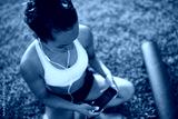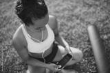 Young woman listening to music in a park after practicing yoga