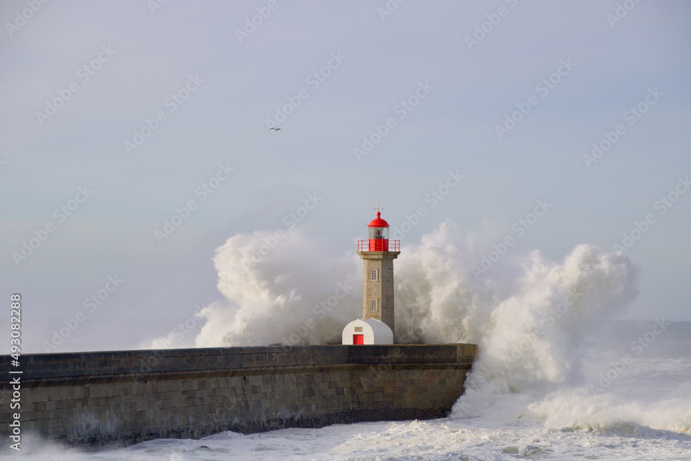 Farol de Felgueiras no Porto, Portugal num dia de ondulação acentuada.