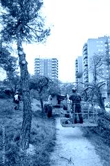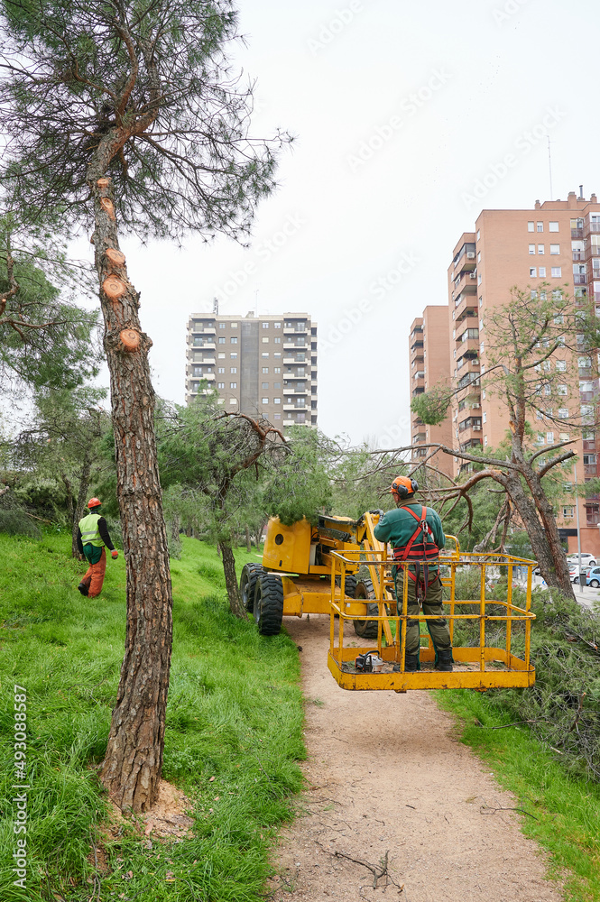 Unrecognizable lumberjack operates a crane with a hydraulic platform to be able to reach the branches of the trees that he has to cut down with a mechanical saw.