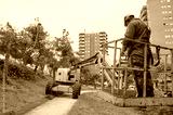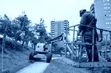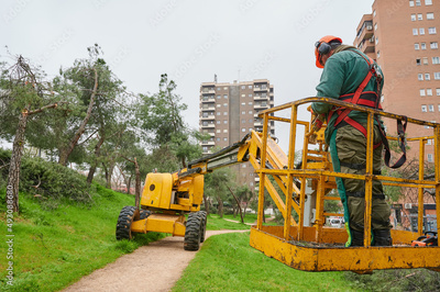 Unrecognizable lumberjack operates a crane with a hydraulic platform to be able to reach the branches of the trees that he has to cut down with a mechanical saw.