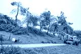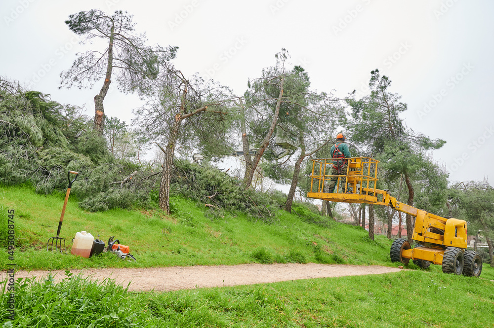 Unrecognizable lumberjack operates a crane with a hydraulic platform to be able to reach the branches of the trees that he has to cut down with a mechanical saw.
