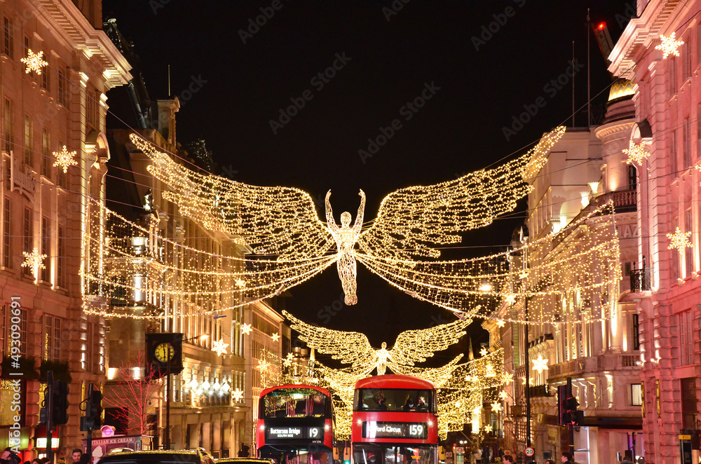 Angel Christmas decorations in night time London with double-decker buses in sight, Regent street