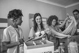 Charity workers placing food into donation boxes for a community outreach food drive of support and help people in Ukraine. Group of volunteers preparing food donations for people in need in Ukraine