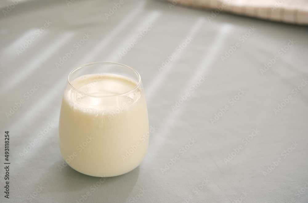 Glass of milk on the table with blue background.