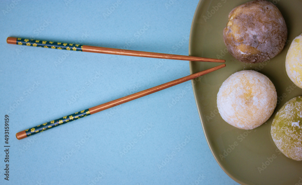 Traditional Japanese dessert mochi in rice dough on gray plate, food chopsticks.