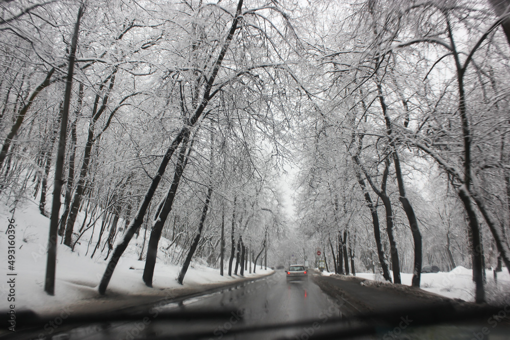 Automobile ride at snowy winter day. View from inside a car on a wet asphalt road surrounded by tall branching trees at cold weather. Cars movement, traffic. Beautiful winter landscape. Travel, trip.