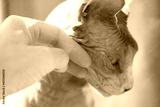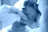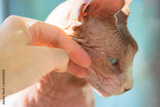 A woman's hand stroking bald leather naked cat. A muzzle of a purebred Canadian Sphynx cat with blue eyes. Human-to-pet contact. Care, love for feline animals at home. Lovely sphinx kitty indoors.