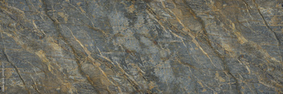 Gray rough mountain surface with yellow-brown veins and cracks. Close-up. Rock texture. Dark rusty stone background with copy space for design. Wide banner. Panoramic. Grunge backdrop.