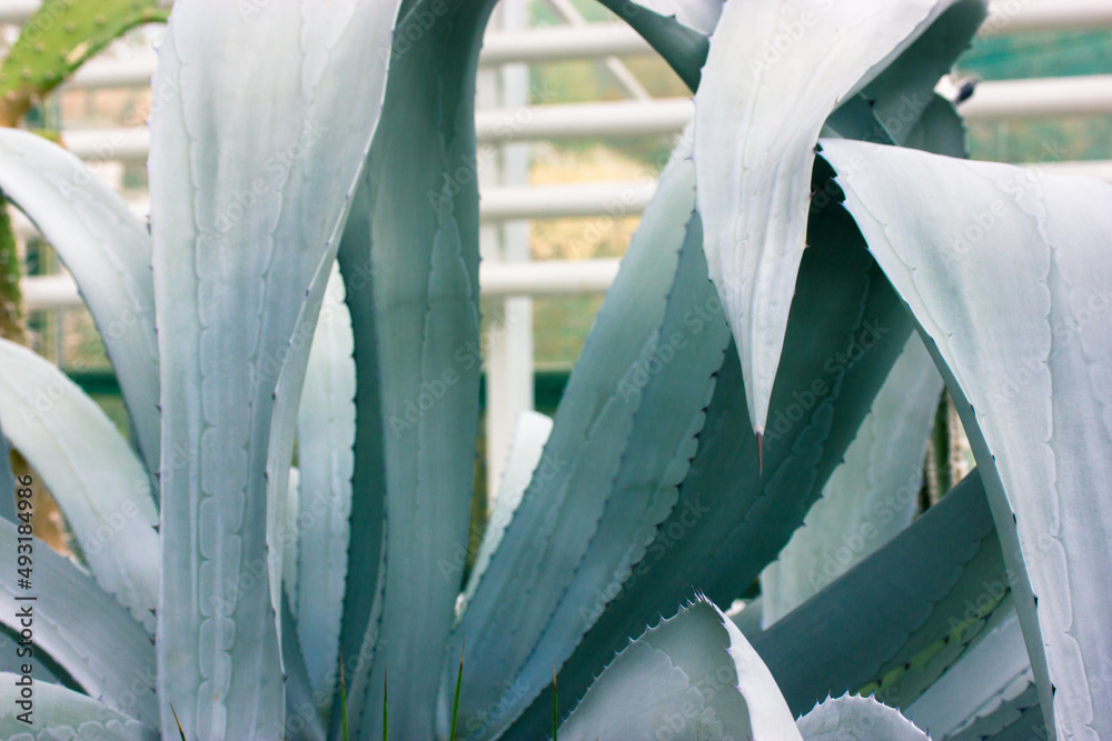Giant blue-green agave leaves with sharp spines. Growing flowers. Botanical garden. Asparagaceae backgrounds textures. Exotic plants of Mexico used in pharmacology, cosmetic products. Cacti succulents