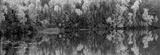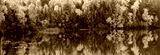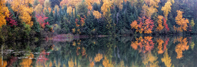 Panorama spectacular fall color scene alongside a lake with reflections in the water. Brilliant orange, red, yellow and green colors adorn this lake in Northern Wisconsin.
