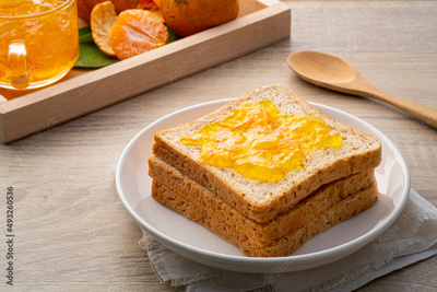 Orange jam on toast in white plate and orange marmalade in a glass with oranges background