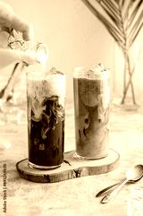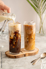 Iced coffee in glass. Pouring milk in glass with coffee. Summer drink.