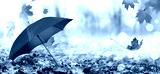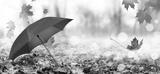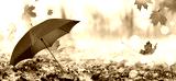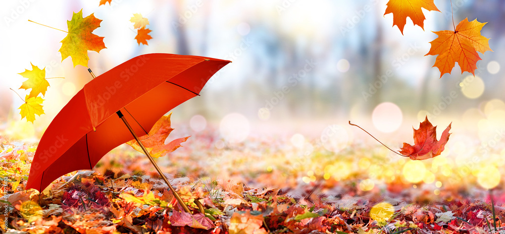 Autumn background with red umbrella and fallen maple leaves