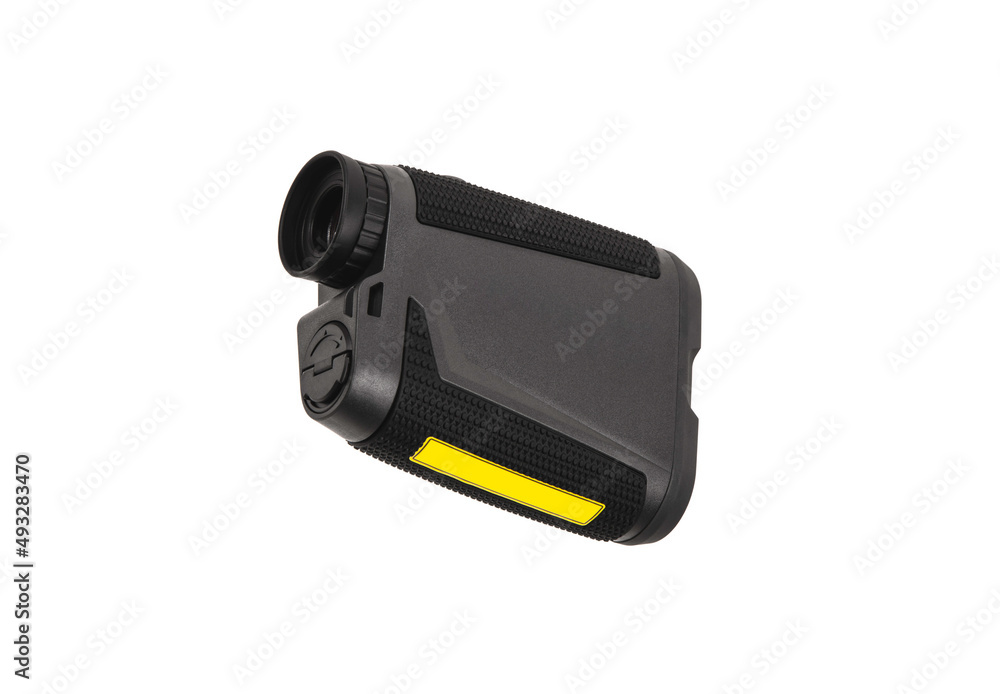 Modern optical range finder isolated on white back. Isolated black plastic rangefinder used for golfing or hunting.