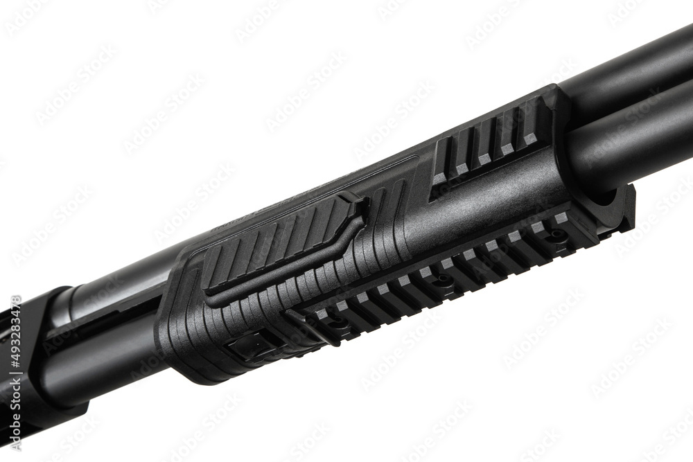 Pump-action 12 gauge shotgun isolated on a white back. Close-up shot of part of a shotgun. A smooth-bore weapon with a plastic stock.