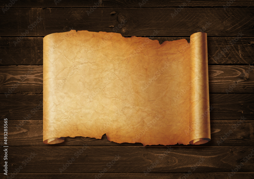 Old mediaeval paper sheet. Horizontal parchment scroll on a wood board