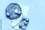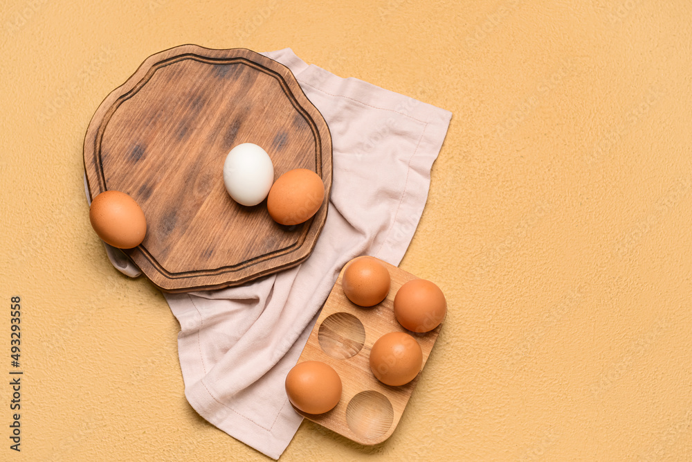 Holder and wooden board with fresh chicken eggs on beige background