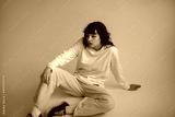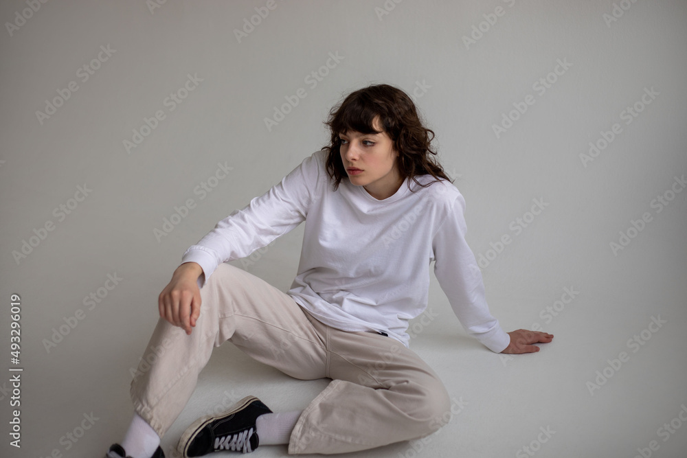 Young woman with curly hair in a white long sleeve t-shirt sits on a white background. Mock-up.