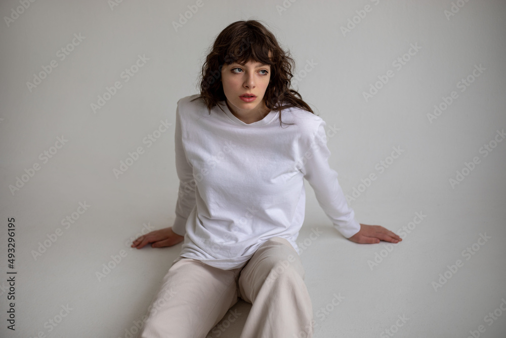 Young woman with curly hair in a white long sleeve t-shirt sits on a white background. Mock-up.