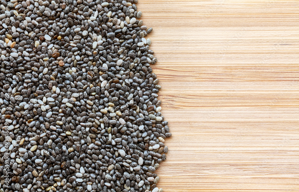 Close up picture of chia seeds on a wooden background, selective focus.