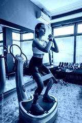 One woman training on the power plate machine female use powerplate for exercise full length legs training