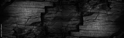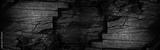 Black white grunge background. Old cracked damaged destroyed stone wall. Close-up. Hole, entrance. Backdrop with space for design. Wide banner. Panoramic. Fantasy, horror concept.