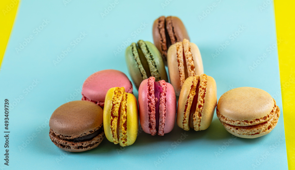 Close-up of macarons cakes of different colors .Culinary and cooking concept. Tasty colorful macaroons.