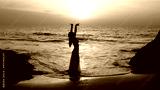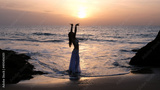 Woman dancing on the shore of the beach. Exotic woman looking at sunset at the horizon dancing belly dance on the beach. Woman raising hands dancing belly dance on the beach with the sunset.