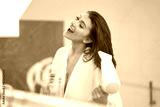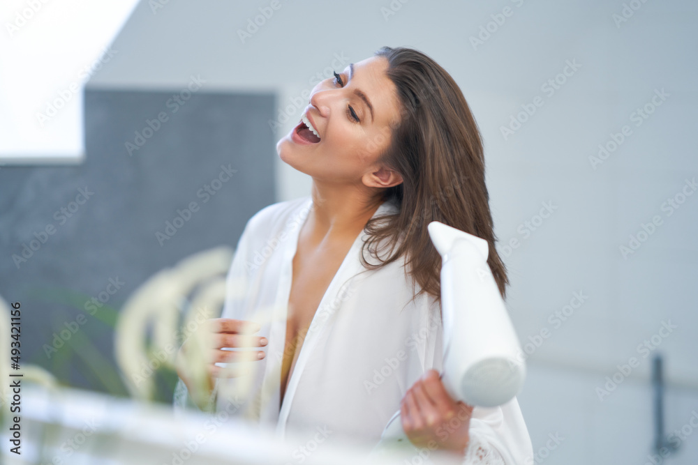 Young nice brunette woman in the bathroom haircare