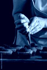 Chef fills the cupcakes with chocolate cream from the confectionery bag. Process of making muffins. Vertical frame.