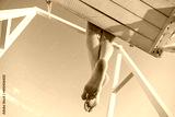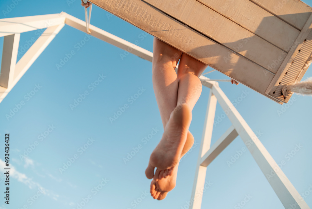Girl sits on the swing hanging bare feet. Bottom view. Bare feet on blue sky background.