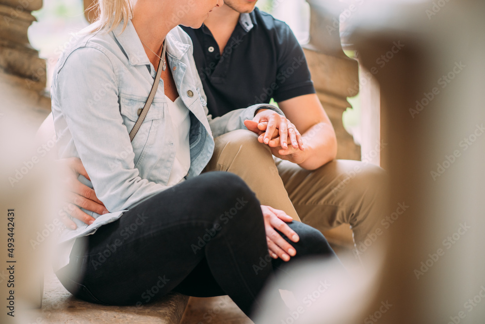Verliebtes Paar sitzt nebeneinander auf einer Treppe in der Sonne und berührt sich mit den Händen