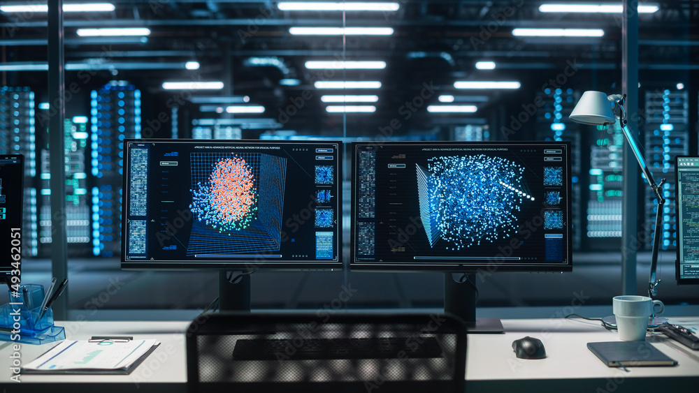 On the Desk Standing Green Mock-up Screen Computer. In the Background Technology Development Laboratory without People. Concept of Cloud Computing and Cyber Security