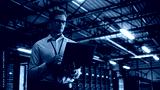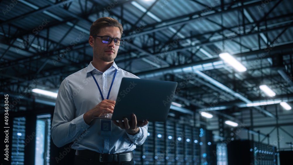Successful Businessman Using Laptop Computer, Standing in Modern Dark Office Working on Financial, Business and Marketing Projects. Low Angle Portrait of Caucasian Manager