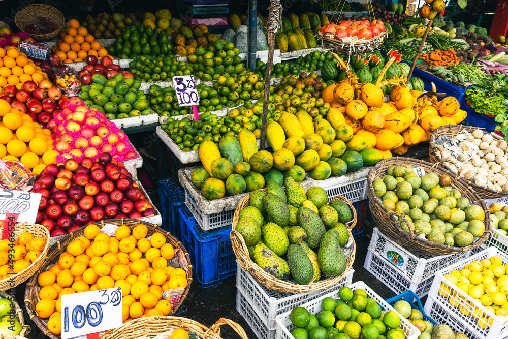 Several varieties of tropical fruits neatly arranged for sale in local market in Sri Lanka.