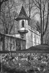 The beginning of spring in the Kielce city park. Historic tower with blurry flowers in the foreground.