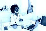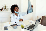 Doctor analyzing an x-ray in a hospital. Portrait of a focused female doctor looking at a set of X-rays in her office. Confident young African doctor in white uniform examining x-ray.