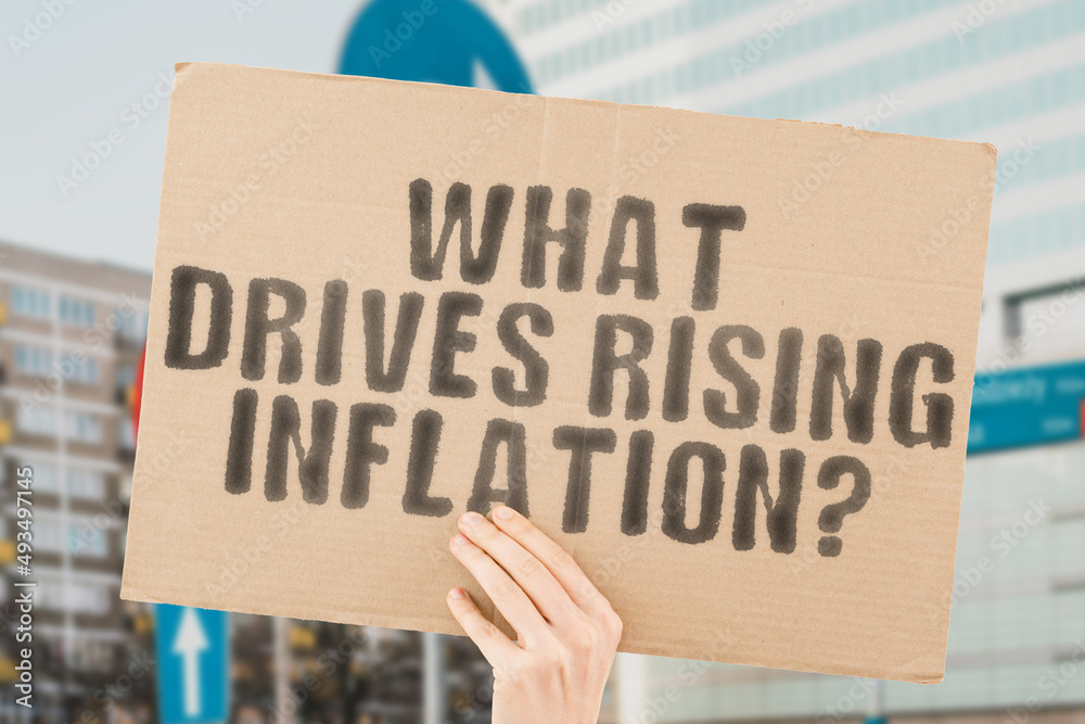 The question " What drivers rising inflation? " on a banner in men's hands with blurred background. Goods. Grow. Income. Insurance. Rise. Up. Value. Wealth. Capital. High. Bankruptcy. Bubble. Growing