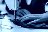 Maßschneider mit Nähmaschine bei der Arbeit horizontal