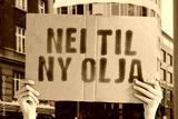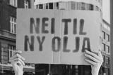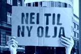 The phrase " Nei til ny olja " on a banner in men's hands with blurred background. Fossil. Pollution. Process. Heavy. Logistics. Stock. Trade. Pumping. Barrel. Nature. Hydraulic. Damaged