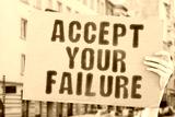 The phrase " Accept your failure " on a banner in men's hands with blurred background. Strategy. Fail. Lose. Succeed. Bankrupt. Crash. Drop. Waste. Fall. Collapse. Acceptance. Bankruptcy. Confused