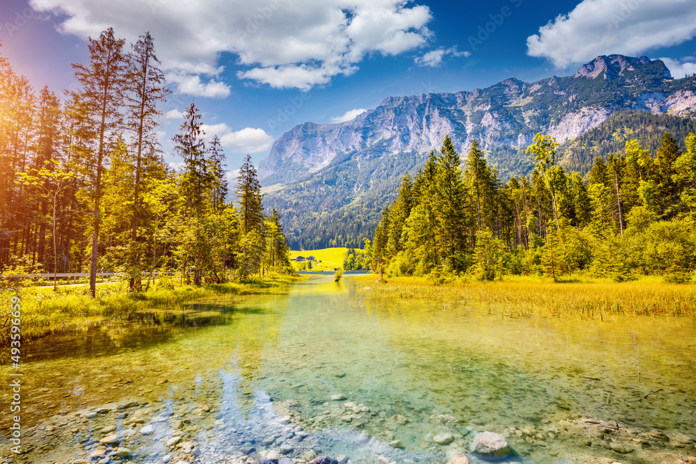 Spectacular scene of alpine lake Hintersee. National park Berchtesgadener Land, Upper Bavaria, Germany, Europe.