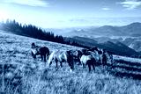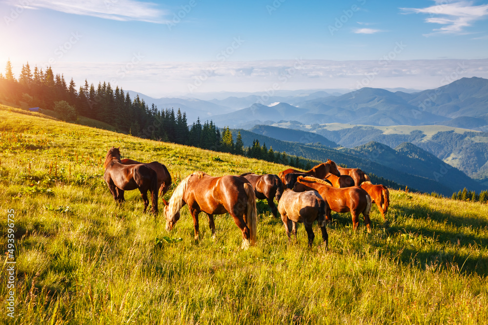 Splendid summer view of pasture with Arabian horse on a sunny day. Carpathian mountain, Ukraine.